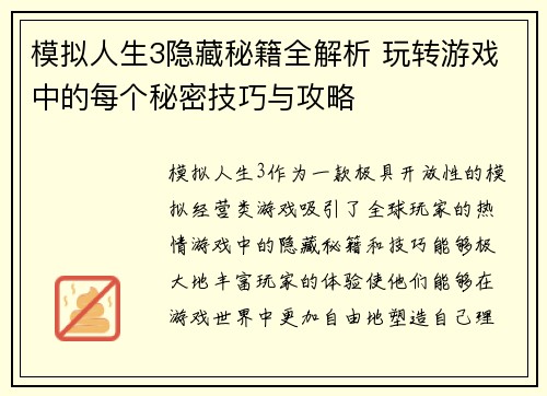文章摘要:随着虚拟现实技术的不断发展,极限驾驶模拟3D挑战赛成为了许多游戏玩家与驾驶爱好者的心头好。它不仅能够带给玩家前所未有的真实驾驶体验,还能够让人们在全景城市中尽情冒险。本篇文章将从多个方面详细探讨这款游戏的魅力,首先介绍其所带来的驾驶真实感,包括车辆操作的精准度、动态环境的变化等;其次讲述其...