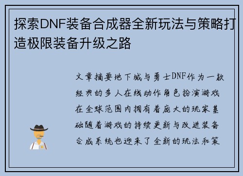 地下城割草神器是近年来在多人在线角色扮演游戏(MMORPG)中备受瞩目的高效武器,深受玩家喜爱。在这篇文章中,我们将从多个角度为大家全面解析如何通过合成系统打造最强的地下城割草神器,助你轻松击败敌人,快速提升游戏中的战斗力。本文将从合成所需的材料、合成过程、神器特性以及如何优化神器装备四个方面进行详...